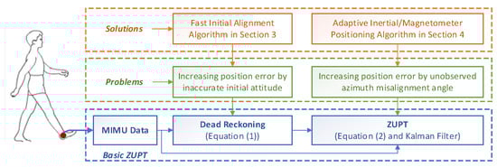 According to the theorem, it can be calculated that the rank of the matrix is 5 and five variables of can be estimated. Essentially the velocity error can be estimated because the observation is velocity error. Hence, other two variables of and are observed. According to references [,], the horizontal misalignment angles can be estimated by ZUPT. Therefore, part of the position error caused by velocity error and the horizontal misalignment angles can be compensated. However, the part of the position error caused by the heading misalignment angle cannot be corrected. It means that the position error caused by the heading cannot be compensated by the basic ZUPT algorithm. The solution for the heading misalignment angle problem will be discussed in Section 4. Figure 1 shows the relationship between the basic ZUPT algorithm, the problems of ZUPT and the proposed algorithms in this paper.