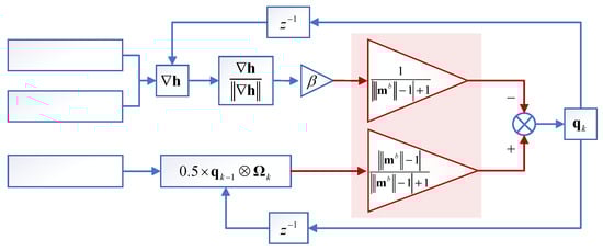 Here, , are quaternion at time k, k − 1 respectively. is differential of at time k. is differential of calculated by the angular velocity measured by gyro, the calculating formula is shown in Equation (3c). is a weight parameter. is the magnetometer measurement with normalized along the b frame. , and () is the magnetometers measurement with normalized along the b frame. is the differential of calculated by AGDA, the calculating formula is shown in Equation (6), the form of is shown in Equation (4). The forms of , , , are as follows: