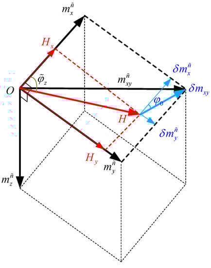 Here, the difference between the and b frame is two horizontal attitude rotations: the first rotation is about the x-axis through an angle , the second is about the y-axis through an angle from b frame to frame. The difference between the n frame and the frame is the heading . The matrix of and are composed of and , respectively as shown in Appendix A. is the magnetic field along the frame after transformation.