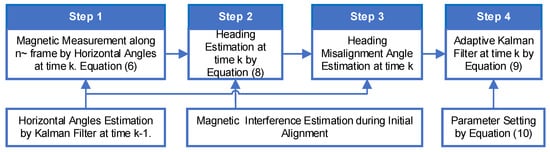 Based on the observation analysis in Section 2.2, the horizontal misalignment angles can be estimated by Kalman Filter for ZUPT. Hence, the magnetic measured by the magnetometers can be transformed to the horizontal frame (Equation (6)) based on the relationship between the Euler angles and the transformation matrix (Appendix A):