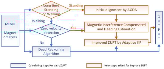 The blue boxes in Figure 5 are the characteristic calculation steps for a basic ZUPT. The orange boxes are the proposed new steps to improve the ZUPT algorithm in this paper. Firstly, initial attitude and the magnetometer interference are estimated by AGDA, which is introduced as the initial alignment algorithm for FIPPS. AGDA can only be used as the initial alignment algorithm, not for ZUPT. Because the ZUPT time is too short, the parameters cannot be estimated by ADGA. Secondly, based on the difference between the magnetometer heading and gyro heading, the heading misalignment angle is introduced as the new observation for the Kalman filter during ZUPT period. In addition, the problem of the change of the magnetic disturbance by surrounding environment is solved by introducing an adaptive parameter in the Kalman filter. These innovative changes enhance position accuracy as the heading error is reduced consistently.