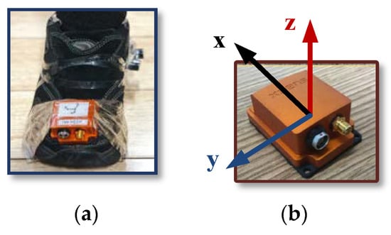 The position and the orientation of externally located MTI-710 on Shoe. (a) MTi-G710 installed on the foot; (b) MTi-G710 and its frame.