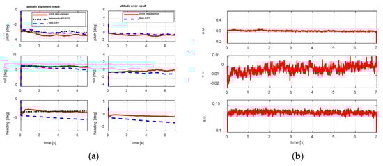From the curves in Figure 7a it can be seen that, the attitude estimation results calculated by AGDA are −3.075°, 6.501°, −3.037°. The convergence time of initial alignment is less than 5 s which meets the requirement of fast alignment for FIPPS. In addition, the horizontal attitude calculated by the basic ZUPT and AGDA are the same as each other. Because the velocity error is the observation for Kalman filter for basic ZUPT, and the horizontal attitude are calculated by the component of gravity measured by accelerometers for AGDA. Therefore, the source information of calculating the two groups of horizontal attitudes are all acceleration from accelerometers. The heading accuracy calculated by AGDA is better than that by basic ZUPT because according to the conclusion in Section 3, the heading misalignment angle cannot observed and estimated by basic ZUPT, but it can be improved by AGDA, which takes the magnetometer as the reference sensor to estimate the heading attitude.