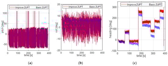 Then, based on this observation, the Kalman filter is used to estimate each navigation error to reduce the positioning error caused by measurement noise of inertial components [,]. The algorithm according to Equations (1) and (2) is called basic ZUPT, which is the basic algorithm and used as the compare algorithm in the experiment section.