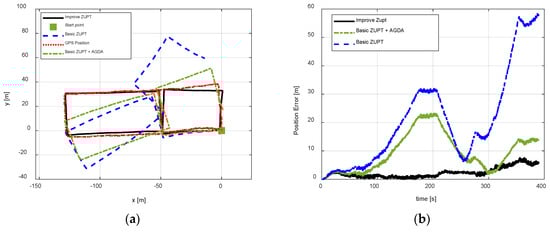 From Figure 8, it can be concluded that the horizontal attitudes calculated by two different algorithms are nearly the same. The test results well fit with the theoretical conclusions in Section 2 and Section 4. The source information for calculating the horizontal attitudes are the acceleration sensed by accelerometers, whether basic ZUPT or AGDA is introduced as the correction method. The heading information in Figure 8c by two different algorithms is different. Because the heading misalignment angle obtained by improved ZUPT was estimated after the magnetic disturbance was compensated during the pedestrian walking stage. However, an accumulated heading error is produced by basic ZUPT because the heading misalignment angles cannot be estimated. Therefore, the problem of unobserved heading misalignment for FIPPS ZUPT is solved by introducing the Inertial/Magnetometer positioning algorithm based on an adaptive Kalman Filter, and the magnetic disturbance is compensated at the same time. Then, the position error can be reduced, which is shown in Figure 9.