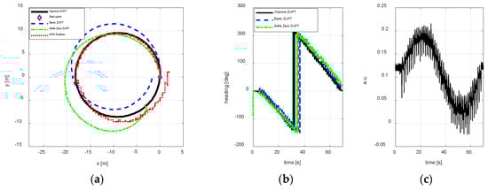 A circular path position result. (a) Trajectory; (b) Heading estimation result; (c) Magnetometer disturbances.