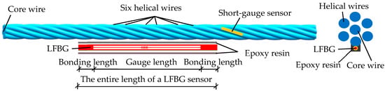 As shown in Figure 2, the strand is composed of a linear core wire and six helical wires. Because the gauge lengths are no longer than several centimeters, most traditional strain sensors, such as the electric resistance strain gauge and the short-gauge FBG sensor, can obtain only the strain of one wire in the strand. However, this measurement cannot represent the true elongation of the strand. Therefore, the sensing part of the LFBG sensor needs to have a length that can touch all the six helical wires in a spiral. For example, the gauge length of an LFBG sensor is about 20–25 cm for stress monitoring to a 7-wire strand. Thus, the entire length of the LFBG sensor can reach 30–35 cm considering that bonding length of each end is set to about 5 cm. Generally, the total thickness of the sensor and the surrounding epoxy resin is less than 3 mm; this thickness is remarkably less than the diameter of a wire and space between the strand and duct.