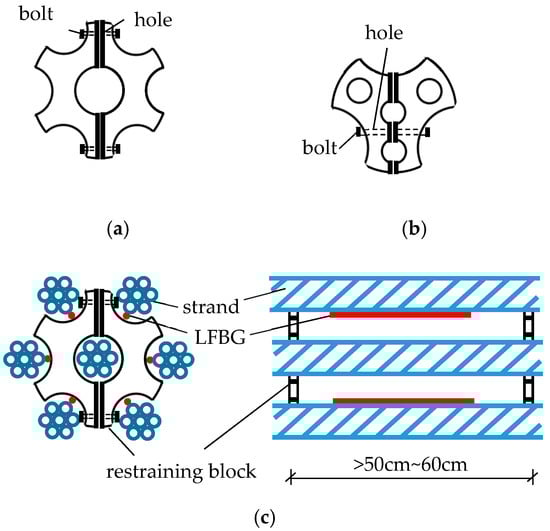 The installation procedure is designed to prevent the installed LFBG sensors from accidental failure caused by friction between adjacent strands and between the strand and duct. The restraining block is used to separate adjacent strands and provide space to the sensor. Figure 3a,b show the designed restraining blocks for a 7-strand tendon and 3-strand tendon, respectively. Every block is assembled of two symmetrical parts by connecting bolts. The central hole of the block can contain the core strand and six helical strands that are separated by six grooves. The practical sketch of the restraining blocks on a 7-strand tendon is illustrated in Figure 3c. The distance over 50–60 cm between the two restraining blocks is long enough to contain the LFBG sensors installed on the strands.