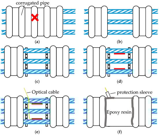 The installation procedure of the LFBG sensor. (a) Place the strands through the marked pipe; (b) strip the partial corrugated pipe; (c) install the restraining blocks; (d) attach the LFBG sensors; (e) connect the sensor to the optical cable; and (f) connect the protection sleeve.