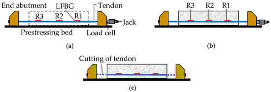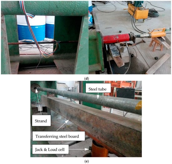 As shown in Figure 5a–c, two abutments are fixed securely at both ends of a prestressing bed, and a high-strength steel tendon is pulled between the abutments before the concrete casting. When the concrete attains the required strength for prestressing, the tendon is cut from the abutments, and the prestress is transferred from the tendon to the concrete member through the bond between them. According to the Chinese Code [47], the total loss σ is the sum of several itemized prestress losses shown in Equation (1):