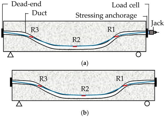 There are three stages (Stages a~c) in a post-tensioned structure from post-tensioning to load bearing. Stages a and b are the tensioning stage and the stage of anchoring, respectively. Stage c is the stage of grout curing and in-service stage of the structure that is shown in Figure 6b.