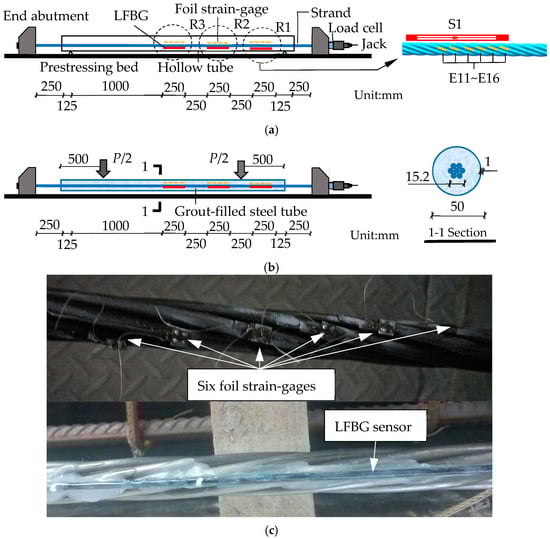 As shown in Figure 7a, a 7-wire strand inserted into a hollow steel tube was fixed at both abutments of a prestressing bed. The tube was held by two supports and separated from the strand. The strand was placed at the center of the tube. The lengths of the strand and hollow steel tube were 3000 mm and 2500 mm, respectively. The nominal diameter and elastic modulus of the strand were 15.2 mm and 200 GPa, respectively. The outside and inside diameters of the hollow tube were 50 mm and 48 mm, respectively. Three monitored regions (R1–R3) with a uniform length of 250 mm were set from the right end to the mid-point of the strand, and the distance between adjacent regions was 250 mm. Three LFBG sensors (S1–S3) with a uniform gauge length of 250 mm were placed on R1–R3, respectively. In each region, each helical wire was attached to a foil strain-gauge (FSG) to measure the strain precisely. The numbering rule is as follows. For example, the 6 FSGs in R1 are named as E11–E16. The first number means the sensor is in R1 and the second number represents the number of the wire. Details are given in Figure 7c about the sensor placement on the wire.