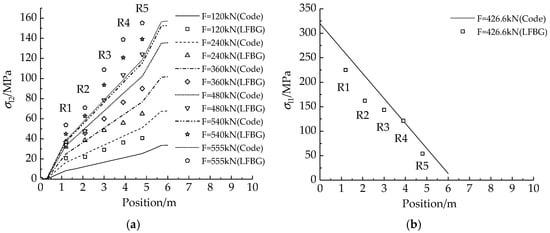 Based on Equations (3)–(7), Table 6 lists the itemized prestress losses calculated from the monitored strains. Because the temperature was kept constant during the test, σl3 is zero. In addition, σl7 is zero because the strand was not cut. σl5 is also zero because the interval between grout curing and loading was short. Compared with the losses calculated from the average values of the measured strains from the FSGs, the losses calculated from the measured strains from the LFBG sensors were closer to the true losses. The error in the latter is only half of that in the former. This result verifies that LFBG sensor has more accuracy than traditional FSG in prestress monitoring.