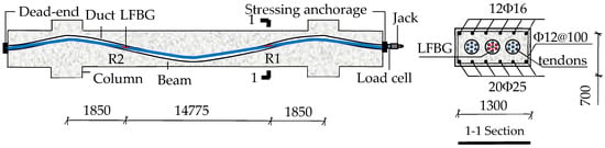 This practical prestress loss monitoring was based on the project of Multifunctional Drama Hall of the Fuzhou Straits Cultural Art Center in Fujian Province, China. The monitored beam had a length of 18.475 m. The width and the height of the beam were 1.3 m and 0.7 m, respectively. Details of the dimensions and reinforcement configuration are shown in Figure 10. Three 7-strand tendons were passed the curved duct, and all strands in three tendons had an identical nominal diameter of 15.2 mm. The ultimate tensile strength and elastic modulus of the strand were 1860 MPa and 200 GPa, respectively. The tensioning was controlled by the oil-pressure gauge of the jack used to apply tensioning to the tendons. There are three loading steps including 10 MPa, 20 MPa, and 28 MPa shown in the oil-pressure gauge to apply the prestresses of 358.40 MPa, 728.0 MPa, and 1023.7 MPa to the tendon, respectively. The applied prestress in the tendon at the final loading step contained an overstressing of 3% to counteract the frictional loss. Due to the anchorage-seating loss σl1, the applied prestress decreased from 1023.7 MPa to 862.3 MPa.