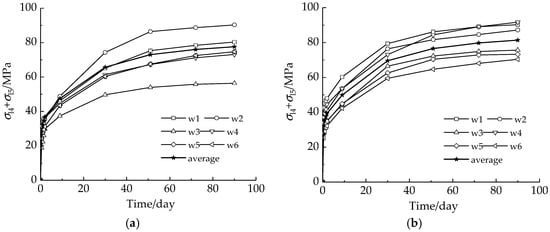 There are three features that may be observed in Table 14 and Figure 12. First, the phenomenon that all LFBG sensors can trace the stress variation proves that the LFBG has enough durability for long-term prestress loss monitoring, and the proposed installation method is valid. Second, the increment of the sum of σl4 and σl5 in each strand has a similar trend. It proves the stability of the LFBG in measurements. Finally, almost 50% losses are completed in 48 h and the monitored data become stable after the 51st day. This feature shows that the prestress loss monitoring should be applied at an early stage of prestressing and last until the loss data tends to stabilize.