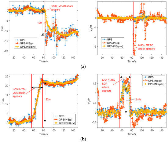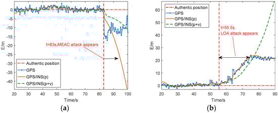 Eastern position error and eastern velocity estimated by Global Positioning System (GPS) and Global Positioning System /Inertial Navigation System (GPS/INS) under Meaconing attacks (MEAC) attack (a) and lift-of-aligned (LOA) attack (b). MEAC attack begins at 83 s and LOA attack is during 55 s to 78 s.