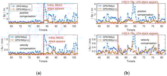 The position and velocity compensation norms estimated by the GPS/INS with position fusion and position/velocity fusion under MEAC attack (a) and LOA attack (b).