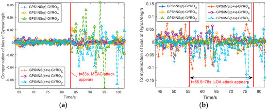 The compensation of gyroscope bias in GPS/INS with position and position/velocity fusions under MEAC attack (a) and LOA attack (b).