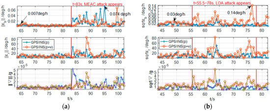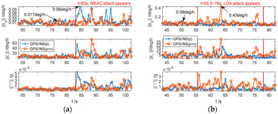 Under LOA attack, as shown in Figure 6b, the increments of ,  and  from the integration system with the position fusion become insignificant. Differently, from the system with the position/velocity fusion, the norms also increase during LOA attack. Although the increments are not as obvious as that under MEAC attack, the maximum value of  reaches 0.14 deg/h, 4.6 times larger than the value under spoofing-free periods.