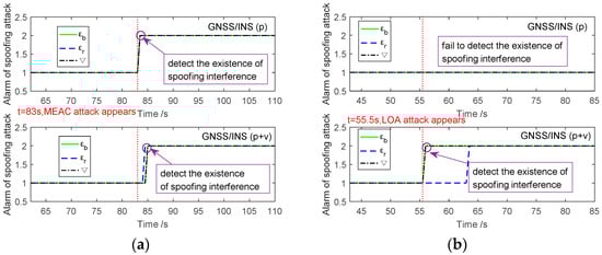Figure 8a illustrates the detection results of MEAC attack in GPS/INS with position and position/velocity fusions. Under MEAC attack, ,  and  of the GNSS/INS with position fusion suddenly rise at 83 s, the moment of MEAC attack beginning. All ,  and  are into the pre-alarm state and spoofing is detected at 83 s. For the GPS/INS with position/velocity fusion, the visible rise of ,  and  follows the occurrence of MEAC attack after about two seconds. Each of them alarms the spoofing after a short delay. Therefore, the voted alarm of MEAC attack is about two second later than the moment of spoofing occurrence. By contrast, under LOA attack, as shown in Figure 8b, any item of ,  and  in system with position fusion fails in alarming spoofing; because, the IMU error compensations increase slightly. Fortunately, these items, especially the  and , of the system with position/velocity fusion, increase dramatically once LOA attack occurs. Although the item  switches into pre-alarm state with 8 s delay, the voted spoofing alarm is at 56 s, close to the occurrence moment of LOA attack. In short, INS error compensations, in both integration systems with position and position/velocity fusions, can be used to detect MEAC attack. LOA attack is likely to be detected effectively by using the INS error compensations from the position/velocity fusion-based integration system. Once the spoofing attack being detected, it is suggested to reject GPS information input to Kalman filter, which is shown in Figure 9.