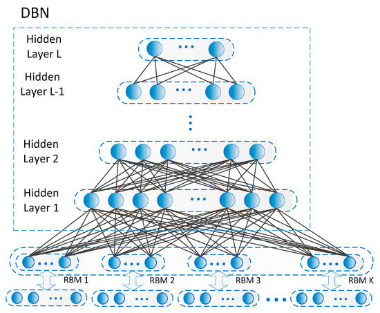 Through reconstruction clustering and weight updates, each feature in the multiple nonlinear subspaces is extracted for each RBM. Then, those low-level features must be further extracted to achieve high-level semantic feature generation. From there, a multi-layer DBN is selected to form the upper network structure of the proposed deep model (Figure 5). DBN is a probabilistic model composed of multiple layers of stochastic, hidden variables. A typical DBN is with one input layer and L hidden layers , … while x is the input data which can be for example a vector, and y is the learning target e.g., class labels. Here, in this application, the lowest layer of the DBM is fully connected with multiple RBMs. With the hidden layers in DBNs, the lower-layer features in the RBM can be further extracted in an unsupervised manner.