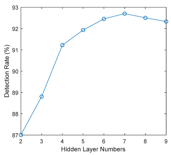 For the setting of hidden layers number. A group of numbers are tested in which 7 hidden numbers are with the best detection rate. As shown in Figure 6.