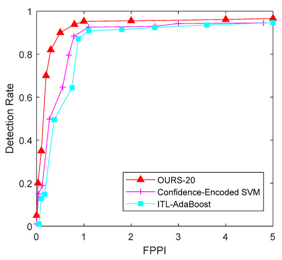 The experimental results are shown in the ROC curve in Figure 7 where the horizontal axis provides the number of False Positive Per Image (FPPI) and the vertical axis shows the detection rate. Here, OURS-5, OURS-10, OURS-20, and OURS-30 denote the classifier, in which the number of subspaces is 5, 10, 20, and 30, respectively. From the ROC curve in Figure 8, it is shown that the proposed deep vehicle classifier achieved the best vehicle detection rate for a subspace number set to 20. Meanwhile, when FPPI was equal to 1, the detection rate of our method OURS-20, VGG-SSD [21], Fast RCNN [24], Cascaded Adaboost [28], ConvNet [29], DCNN [30] and YOLOv3 [31] were 92.75%, 91.10%, 94.20%, 79.50%, 87.58%, 85.75% and 93.35%, respectively. Here, Fast R-CNN had the best performance in the non-transfer experiment and YOLOv3 and OURS-20 had the second-best performance. The reason for these results might be due to the advantages of the DCNN structure of image representation compared to the DBN structure. The training time for the proposed method is around 2.5 h in our experimental platform. Besides, the average processing time for the seven methods (OURS-20, VGG-SSD, Fast R-CNN, Cascaded Adaboost, ConvNet, DCNN, YOLOv3) are 175.8 ms, 963.1 ms, 562.6 ms, 33.9 ms, 80.6 ms, 139.5 ms and 104.7 ms for an input image of 1920 × 1280 scale without code optimization and acceleration.