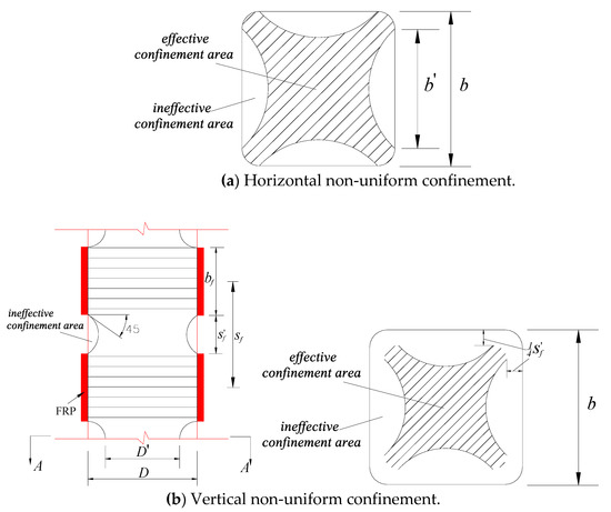 Compared with circular columns, the reduced confinement in square columns can be evaluated using the following shape factor , according to the “arching action” as well in the horizontal level [30,35,46]: