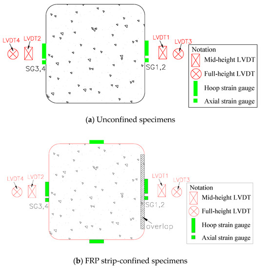 The mid-height axial deformation of the columnar specimens was recorded by two linear variable displacement transducers (LVDTs) (LVDT 1 and 2, see Figure 3), covering a gauge length of 200 mm. Another two LVDTs (LVDT 3 and LVDT 4, see Figure 3) were included to measure the full-height axial shortening. Four unidirectional strain gauges (SGs) were installed at the mid-height of the unconfined columnar specimens to measure the strains in the concrete; among them, two 100 mm SGs at 180° apart were for axial strains and the other two 80 mm SGs 180° apart were for lateral strains. The hoop and axial strains in the FRP jacket at the mid-height plane were captured by six unidirectional SGs mounted on the mid-height plane of each FRP-wrapped columnar specimen (see Figure 3b for more details).