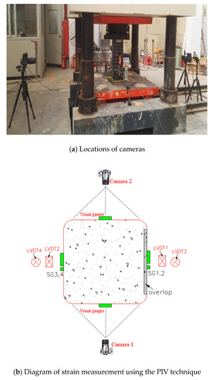 Additionally, the PIV sensing technique was employed to record the strains (i.e., both axial and hoop strains) along the height of selected FRP strip-confined specimens (whether the technique was applied is indicated in Table 1). This PIV sensing technique was realized by tracking the spatial variation of brightness of the test patches utilizing the geoPIV software developed by White et al. [42]. An image analysis algorithm in the software is adopted to track the displacement of each patch in the subsequent images. The focused surfaces of the specimens were sprayed with black paint while the texture was formed by white paint. Details of the test set-up can be found in Zeng et al. [22]. Two Canon 5D-Mark II digital cameras were utilized to record the images of the displacement of the specimens during testing (Figure 4a). The interval between two successive shutters was three seconds. The center normal vector of the lens is perpendicular to the vertical shaft of the columns, while the schematic diagrams in Figure 4b show the locations of the cameras. Figure 5 shows the locations of visual strain gauges based on the PIV sensing acquisition. Note that the PIV technique has been employed to measure the strains in FRP (e.g., [22,43]) and the accuracy of the PIV sensing technique has been proved by Zeng et al. [22] by applying both the PIV sensing technique and conventional strain measurement techniques to the same specimen. The stress–strain curves of the confined concrete from the both sources were close to each other.