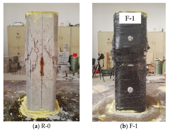 High-strength gypsum mortar was used to level each of the specimen ends, and thus the axial load is uniformly applied on the whole section. A column compression test was realized in a hydraulic machine for compression loading using a displacement control mode with a 0.24 mm/min rate for unconfined columnar specimens and a 0.50 mm/min rate for FRP strip-confined columnar specimens. All test data was recorded by data logger.