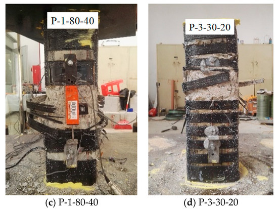 Each column has a specified name (see Table 1) with the letter “P” to denote “partial” (“F” represents “full”) at the beginning and then followed by a value denoting the FRP layer numbers. Following this, there is a number denoting the width of the strips and at the very end, there is a number denoting the clear spacing. For example, ‘P-3-100-40’ represents a specimen wrapped with three-layer FRP strips with a width of 100 mm and a clear spacing of 40 mm.