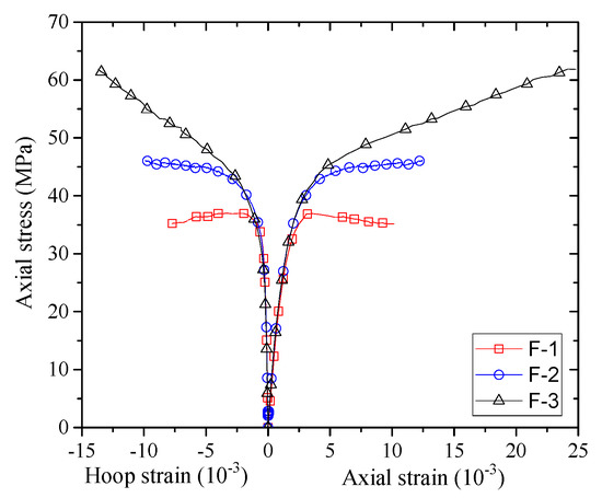The stress–strain curves of confined concrete in the columnar specimens are shown in Figure 7, Figure 8, Figure 9, Figure 10 and Figure 11. As the axial stresses in a confined square column are non-uniform, the presented axial stresses in concrete are average stresses which were obtained by dividing the axial loads by the gross sectional area. The average mid-height LVDT readings were adopted for the axial strains, which have also been adopted by previous researchers (e.g., [45]). The reported stress–strain curves cease when FRP rupture took place. The stress–strain curves of confined concrete in the FRP fully wrapped square columns (Group I) are shown in Figure 7. For specimens F-2 and F-3, the axial stresses show monotonic ascending, while specimen F-1 shows a slightly descending second portion. The reason for the descending behavior is that the column was confined with a small amount of FRP while a monotonic ascending behavior required sufficient FRP confinement.