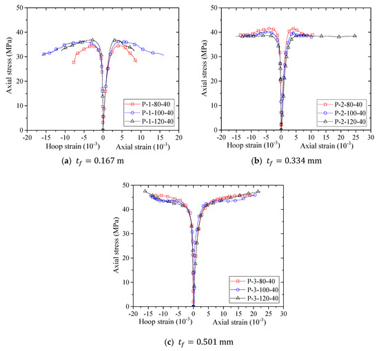 The experimental results for the columnar columns are given in Table 1. The ultimate axial stress () equals to the peak axial stress () for specimens with a monotonic ascending stress–strain response, and thus only the peak axial stresses are given in Table 1. Note that for the results from specimens with a descending second portion, the peak axial stresses instead of the ultimate axial stresses are discussed. The normalized peak axial stresses () and normalized ultimate axial strains () are also reported in Table 1. As shown in Table 1, the normalized peak axial stresses () range from 1.01–1.37 and the normalized ultimate axial strains () range from 3.00–9.28. and increase with the increase in FRP strip thickness and width, which can be easily seen from Table 1. It should be mentioned that although the for several specimens is low (e.g., P-1-80-40 and P-1-100-40), the axial strain enhancement ratio is quite high, which is also valuable in practice. For specimens with an identical FRP volumetric ratio, the of specimens with partial FRP confinement are generally larger than those of specimens with full FRP confinement, as can be concluded by comparing the ultimate axial strains of specimens F2, P-3-80-40, P-3-40-20 and P-3-120-60.