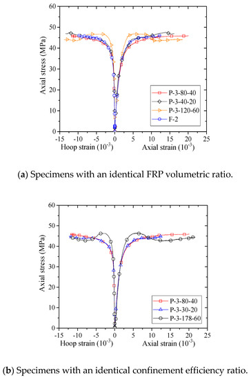 Stress–strain curves of concrete in the specimens with an identical FRP volumetric ratio and an identical confinement efficiency ratio.