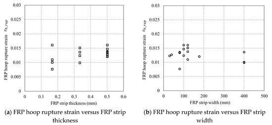 Figure 13 shows the FRP hoop rupture strains () versus the FRP strip thickness/width. FRP hoop rupture strains were found to be independent to the thickness and width of FRP strips. The FRP strain efficiency factor (i.e., the FRP hoop rupture strain over the FRP coupon tensile rupture strain) for each specimen is given in Table 1. The average FRP strain efficiency factor is 0.67, which is very close to the FRP strain efficiency ratios reported in previous studies (e.g., [46,47,48,49]).
