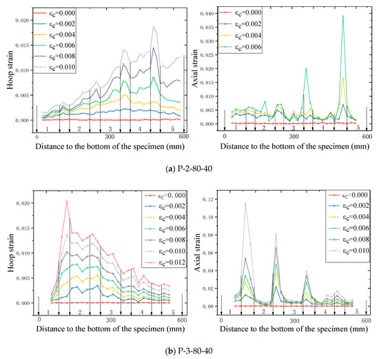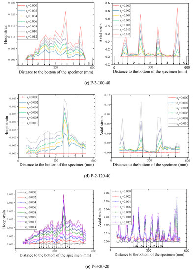 The axial strains increase consistently at all hoop strain levels, suggesting a credence of the PIV sensing technique. It can be seen from Figure 14 that, generally, the axial strains as well as the hoop strains in the concrete between two adjacent FRP strips are larger than those in the FRP (i.e., at the mid-plane of each FRP strip) for the test columnar specimens, which has also been found by Zeng et al. [22] on circular columns. This is because at a given hoop strain, the confinement in the concrete between two adjacent FRP strips is weaker than that in the concrete at the mid-plane of each FRP strip level, leading to a larger strain in the mid-way concrete. This also explains why the of confined concrete in FRP partially wrapped square columns is smaller than that of confined concrete in FRP fully wrapped square columns, as has been mentioned in the previous section. It is interesting to find that the strains on specimen P-2-80-40 were concentrated toward the upper end of the specimen while the strains on specimen P-3-80-40, conversely, concentrated toward the bottom end. This is probably due to the local failure of concrete, owing to its homogeneity, which was also reported by Bisby and Take [48].