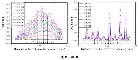 The distribution of strains over the specimens at different hoop strain levels is shown in Figure 14, in which the horizontal axis is the distance between the current level to the bottom of the columnar specimen. Note that in Figure 14, the locations of the FRP strips are denoted by the numbers between two adjacent arrows. All the strains reported in Figure 14 were recorded utilizing the PIV sensing technique, with the virtual SGs being shown in Figure 5. The gauge length for all the optical strain gauges in the PIV system was 20 mm, which equals to that of the foil SGs for FRP strains adopted in the current study.