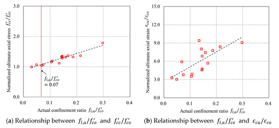 Figure 15a shows the relationship between the actual confinement ratio (i.e., ) and , which exhibits a linearly proportional relationship between and . Figure 15a also indicates that a value of greater than 0.07 leads to a strain hardening behavior of confined concrete in FRP partially wrapped square columns, demonstrating that the definition of the minimum amount of FRP derived from FRP-confined circular columns [47,50] is also applicable to FRP-confined square columns. Figure 15b shows a proportional relevance between and , while it is not as high as that between and .