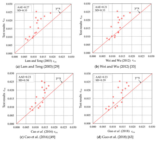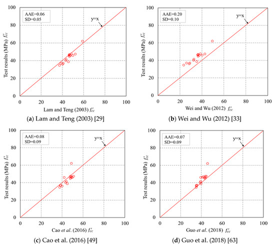 The and of the specimens predicted by the four representative models were compared with the experimental results. The assessment based on comparisons between experimental and theoretical results of the ultimate condition can properly tell the accuracy of the models as the ultimate condition approximately determines the shape of the stress–strain curve. The predicted curves cease at a hoop strain equal to the average FRP hoop rupture strain. The standard deviation (SD) and average absolute error (AAE) between test results and predictions were utilized to assess the representative models, as can be seen in Figure 16 and Figure 17. It is found that in Figure 16, Lam and Teng’s [29] model is superior to the other three models for . For Lam and Teng’s [29] model, both the AAE and SD values are small, indicating a good accuracy of the model in predicting of confined concrete in FRP partially wrapped square columns. The experimental are compared with the theoretical results, as shown in Figure 17. An interesting finding from Figure 17 is that Wei and Wu’s [33] and Guo et al.’s [63] models are slightly better than the other models for . However, the accuracies of all four representative models are similar with respect to , and both the AAE and SD values are quite large, implying that all four representative models are inaccurate in terms of generating .