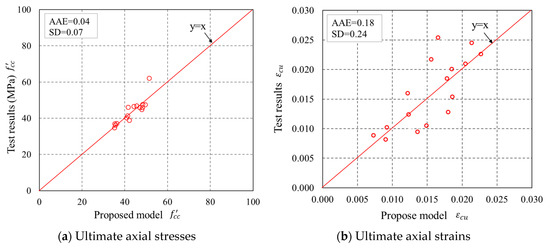 Performance of the proposed model in predicting the ultimate axial stresses and ultimate axial strains.