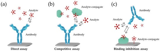 Schematic presentation of assay formats generally used for small-molecule detection. (a) In a direct assay, target analyte binds to the recognition element, e.g., the antibody which is immobilized on the sensor surface; (b) In a competitive assay, the analyte competes with its conjugate for the binding to the immobilized recognition element; (c) In a binding inhibition assay, similarly the analyte and analyte-conjugate compete for the binding, but the analyte-conjugate is the one immobilized on the sensor surface either directly via a linker or as a protein-conjugate. Also, other recognition elements besides antibodies are applied to biosensor development using the same assay formats.