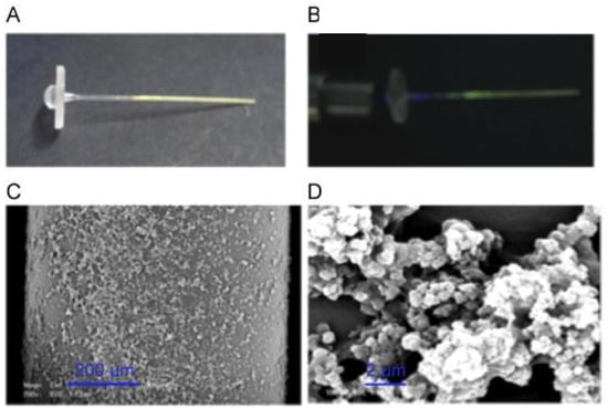 (A) Photograph of the polystyrene evanescent wave fiber optic waveguide coated with fluorescent 2,4-D MIP particles using polyvinyl alcohol as glue. (B) Injection of the light with a fiber optic bundle and collection through the lens (λexc = 410 nm; λem = 515 nm). (C,D) SEM micrographs of the surface of the 2,4-D-MIP-coated optical fiber (reprinted from [45] with permission from Elsevier).