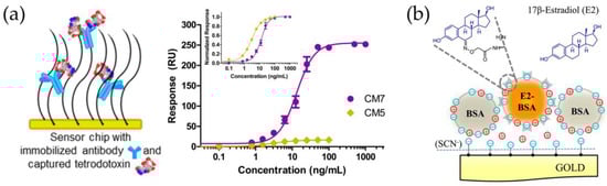 (a) For tetrodotoxin detection, the antibody was covalently immobilized onto carboxymethylated (CM) dextran surface (left). A comparison of high-density CM7 and low-density CM5 surfaces for antibody immobilization (right). (b) Schematic representation of the immobilization of estradiol(E2)-BSA conjugate within the BSA matrix utilizing the electrostatic levitation phenomenon for forming a “fluid”-like interfacial membrane with rotation freedom and in-plane mobility of membrane components ((a), reprinted from [69], copyright (2014) American Chemical Society; (b), reprinted from [86] with permission from Elsevier).
