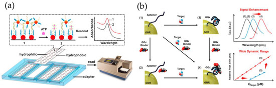 (a) Wall-less LSPR array chip for detection of adenosine triphosphate (ATP) using a normal microplate reader. Plasmonic nanoparticles (NPs) are immobilized on hydrophilic–hydrophobic patterned glass slide and a double-gold NPs system constitute a competitive replacement assay for signal amplification. (b) LSPR sensor for small molecule detection based on (1) aptamer-modified gold nanorods (GNRs), (2) addition of the G-quadruplex (GQx) binder, (3) addition of a target that induces GQx structure, and (4) addition of the target and GQx binder; interaction between the GQx binder and GQx occurs. GQx binder provides signal enhancement and enables a broad dynamic range. (a, reprinted from [113]; b, reprinted from [119], both with permission from Elsevier).