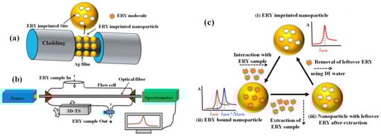 Schematic of (a) fabricated sensing probe for the detection of erythromycin (ERY) using the fiber optic core decorated with the coatings of silver and a layer of ERY imprinted nanoparticles (b) experimental set-up and (c) sensing mechanism. Figure reprinted from [142] with permission from Elsevier.
