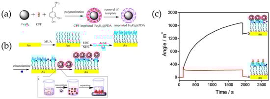 Enhancement in AChE-based detection has been achieved using magnetic MIPs with recognition sites for pesticide CPF, which enabled enrichment of the target to the sensor surface. Magnetic MIPs were synthesized by self-polymerization of dopamine on the surface of Fe3O4 nanoparticles in the presence of the template CPF. Rebinding of the target and analysis of these CPF-imprinted nanoparticles by AChE-based SPR showed a low detection limit of 0.76 nM due to the significant signal amplification caused by the high molecular weight of the MIPs. Compared to direct analysis of CPF, approximately 64 times higher SPR angle shift could be observed with CPF-imprinted nanoparticles (Figure 6). Although CPF rebinding to MIPs required 12 h incubation, which can be considered as a limiting aspect, the MIP-based method showed excellent selectivity against other pesticides tested [153].