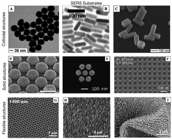 SEM images of different types of SERS substrates. (A) Spherical gold nanoparticles, (B) gold nanorods, (C) silver nanobar, (D) silver plasmonic nanodome array, (E) gold nanocluster, (F) gold nanoholes, (G) silver nanovoids, (H) silver nanocolumnar film, and (I) silver nano-pillars. Reprinted with permission from [158], copyright (2017) De Gruyter.