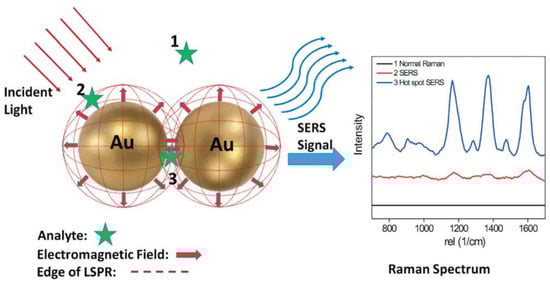 Schematic of SERS effect for a small molecule on gold nanoparticles (AuNPs). (1) Analyte outside the enhanced magnetic field (red dotted lines), no Raman signal is observed; (2) analyte located within the enhanced magnetic field but at long-distance, and (3) analyte located within a “hot spot”. Reprinted with permission from [159]. Copyright 2015 The Royal Society of Chemistry.