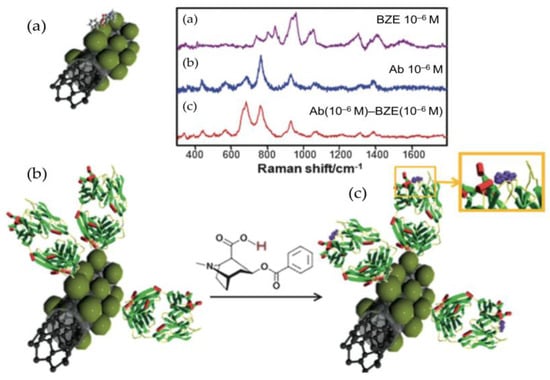 Schematic representation of benzoylecgonine (BZE) detection by SERS using silver-coated carbon nanotubes (CNT@Ag). Direct binding of BZE to AgNPs (green spheres) (a), label-free indirect detection of BZE on CNT@Ag coated with BZE-specific antibody fragment alone (b) and in complex with BZE (c). Corresponding SERS spectra are depicted in the graph on top. Figure reprinted from [169] with permission from The Royal Society of Chemistry.
